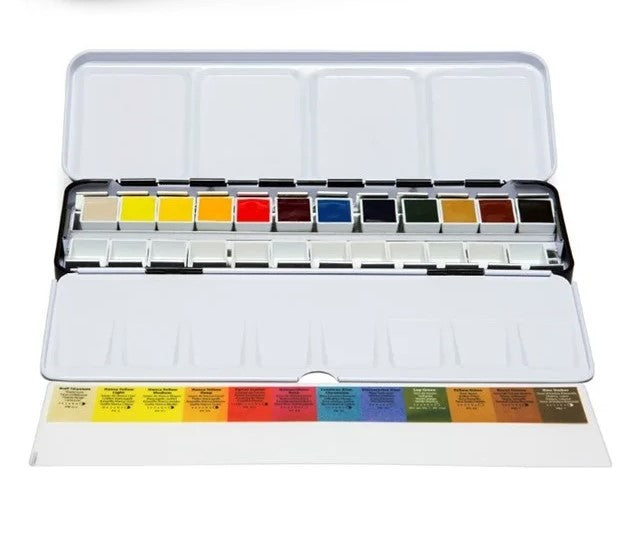 The set of 12 watercolours includes split (cool & warm) primaries, a gorgeous secondary green, and four earth tones in a convenient, sturdy metal box – ready for the studio, coffee shop, or on-the-go trips to anywhere!