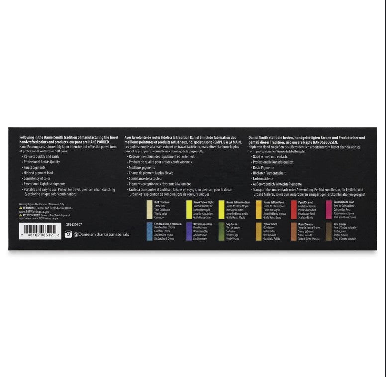 Our half pans are always hand-poured, following the DANIEL SMITH tradition of manufacturing the finest handcrafted paints and products. Hand pouring is highly labour-intensive, but it offers the purest form of professional, artist-quality watercolours that rewet quickly and easily with a damp brush. Enjoy the finest pigments in portable half-pan sets that are perfect for travel, plein air work, urban sketching & creating unique colour combinations.