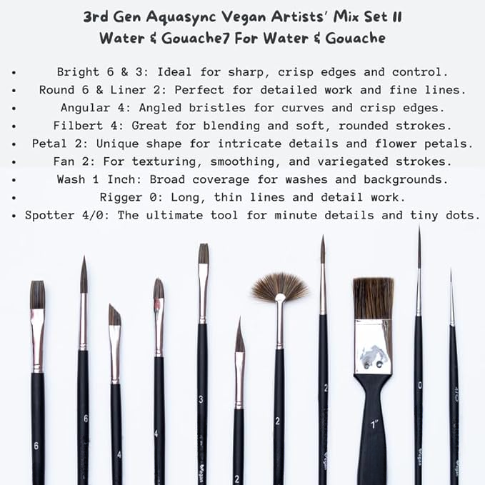 Explore your artistic potential with the Like it Lite Mixed Brush Set of 11, meticulously crafted for versatility and precision. This comprehensive collection includes a variety of brush types and sizes designed to accommodate an array of techniques and mediums. From the bold strokes of the Bright 6 to the delicate touch of the 4/0 Spotter, each brush is engineered for performance.