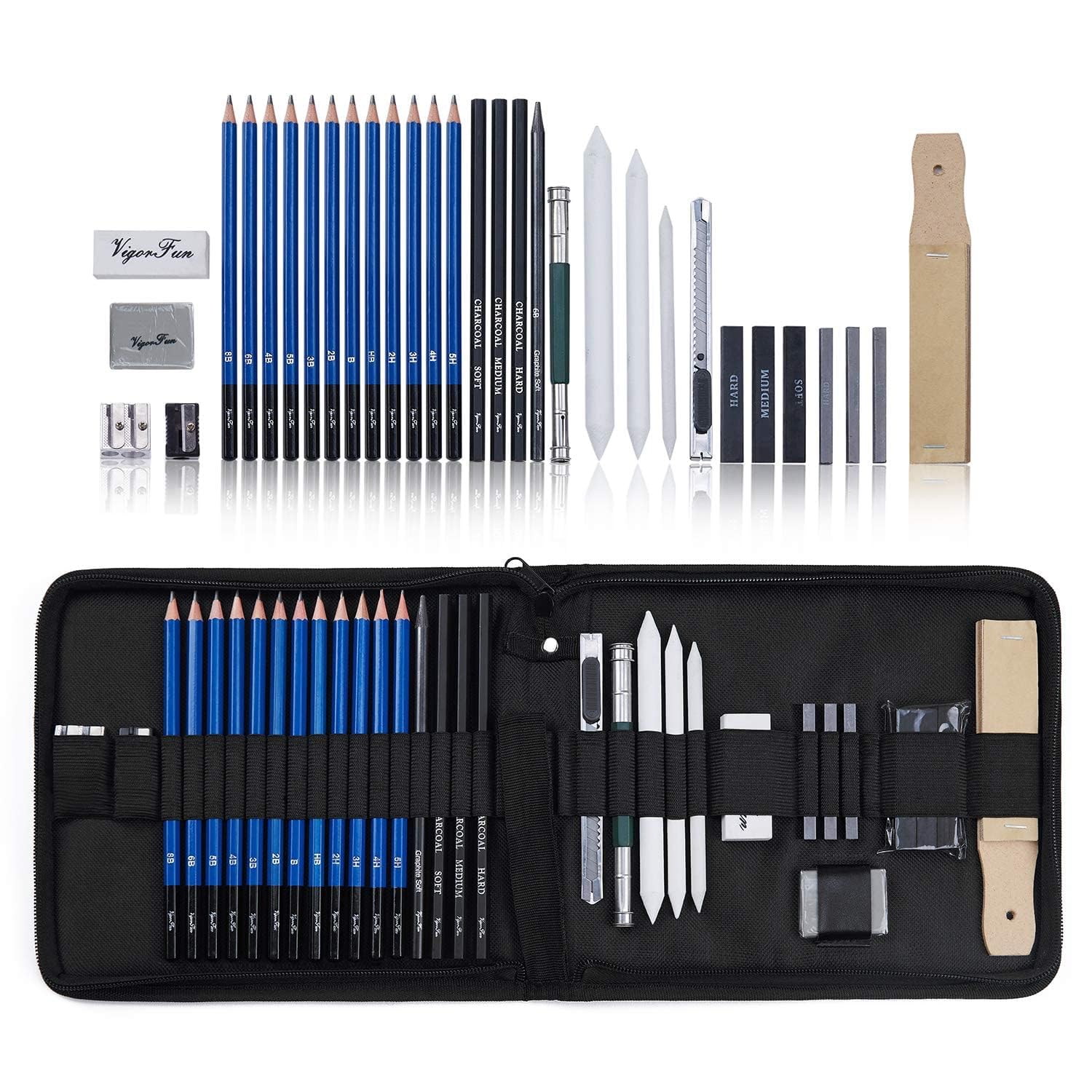 Versatile Drawing Tools: The set contains a variety of pencils, charcoal, graphite, and paper stumps for shading, blending, and creating different textures and effects.