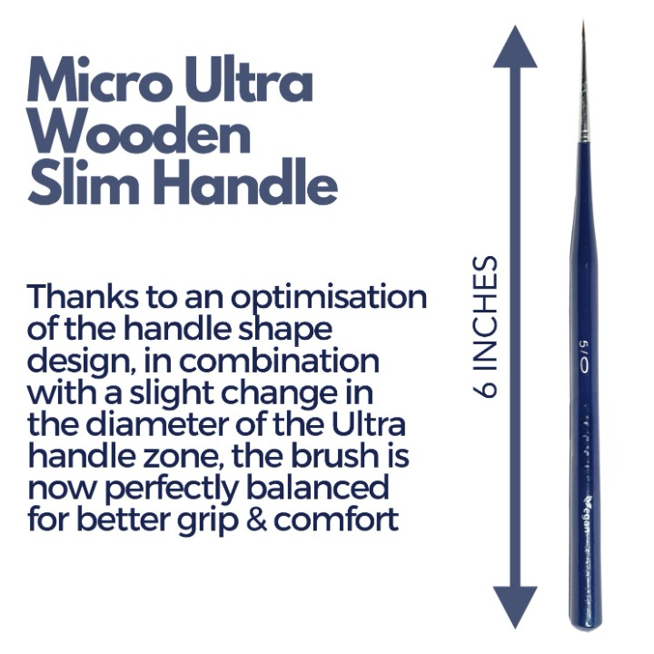 Ultra Micro Spotter miniature spotter detail brushes, comes with New Short, Slim Comfort Grip handles and compact micro spotter tips are perfect for tight spaces and they offer superb control for tiny details or miniature painting. These brushes comes with Kolinsky Synthetic (Imported From Germany) that are set glued with slim brass ferrules and mounted on Royal Blue Wooden handles.