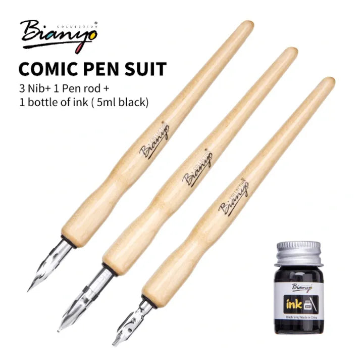The Bianyo Comic Dip Pen Calligraphy Suit is a complete set of three dip nibs for Calligraphy artists. The calligraphy set consists of 1 wooden dip pen, 3 different nibs and 1 ink bottle. The 3 different nibs are also designed to be used for Roman text and Italic letters.